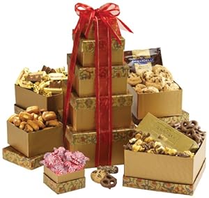 - Gift tower includes: assorted sweets, honey mustard pretzels, chocolate chip cookies, hot cocoa, Toblerone chocolates, butter crunch toffee, chocolate covered pretzels, & chocolate drizzled caramel popcorn.